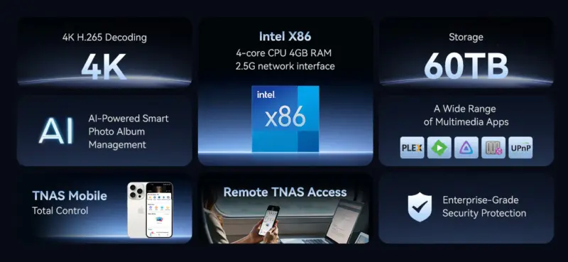 Het TerraMaster TOS-besturingssysteem biedt een overzichtelijke webinterface met ondersteuning voor snapshots, cloud-synchronisatie, back-upsoftware, mediastreaming en Docker containers. Hierdoor kan de NAS functioneren als centrale opslagserver, mediaserver, private cloud of applicatieplatform binnen een modern thuisnetwerk of klein kantoor.
