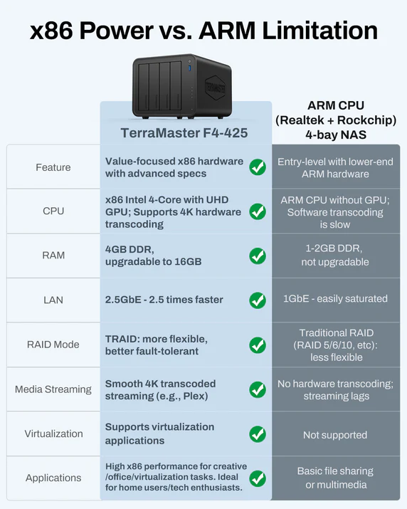 De TerraMaster F4-425 is een veelzijdige en krachtige NAS-oplossing voor gebruikers die meer willen dan alleen bestandsopslag. Dankzij de moderne Intel N-series quad-core processor levert dit systeem uitstekende prestaties voor gelijktijdige taken zoals back-ups, mediastreaming, containers en lichte virtualisatie.