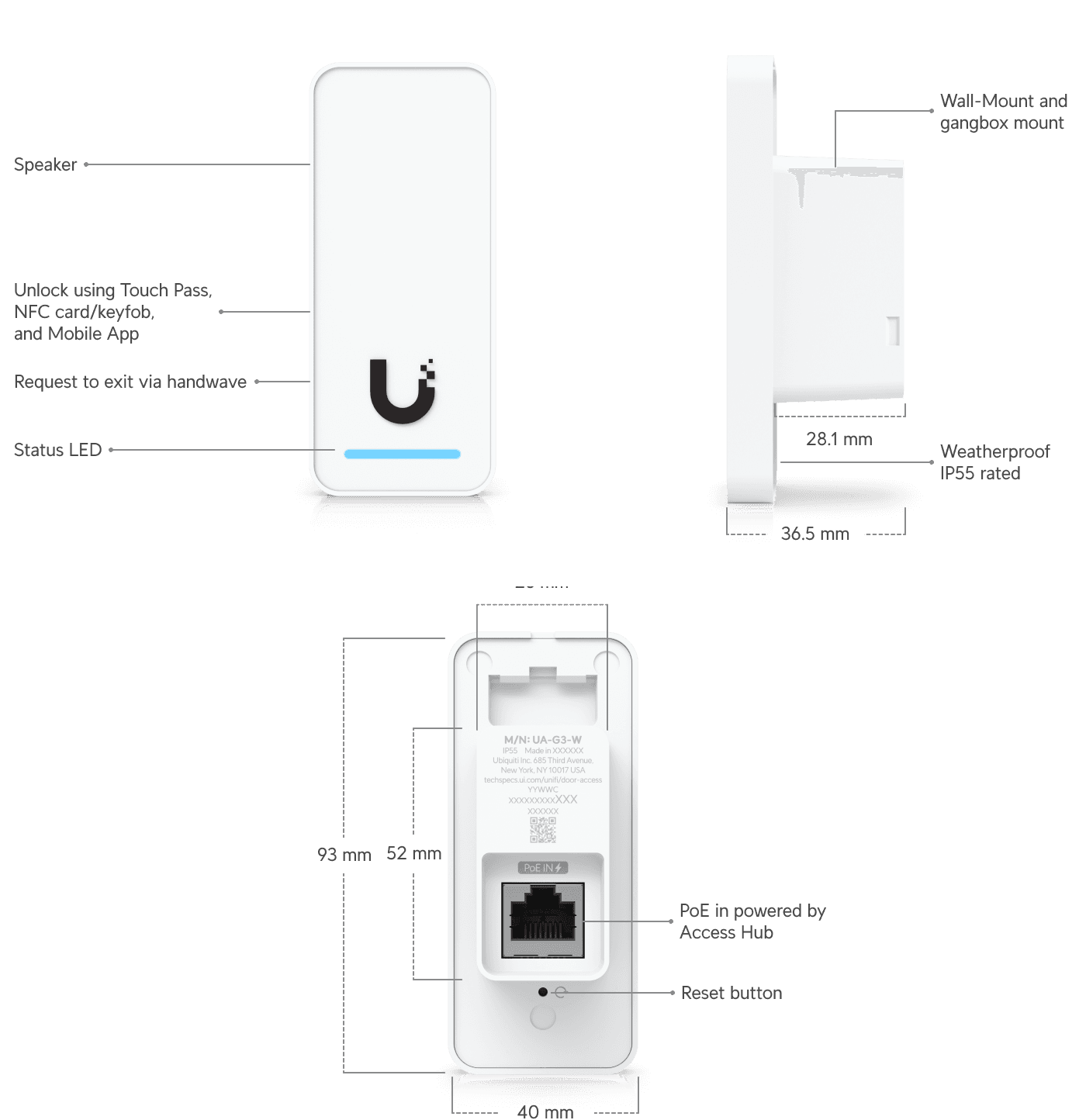 A simple, all-in-one kit for UniFi Access, designed to manage a single door with one reader. Supports seamless setup and Touch Pass for modern, secure access control.