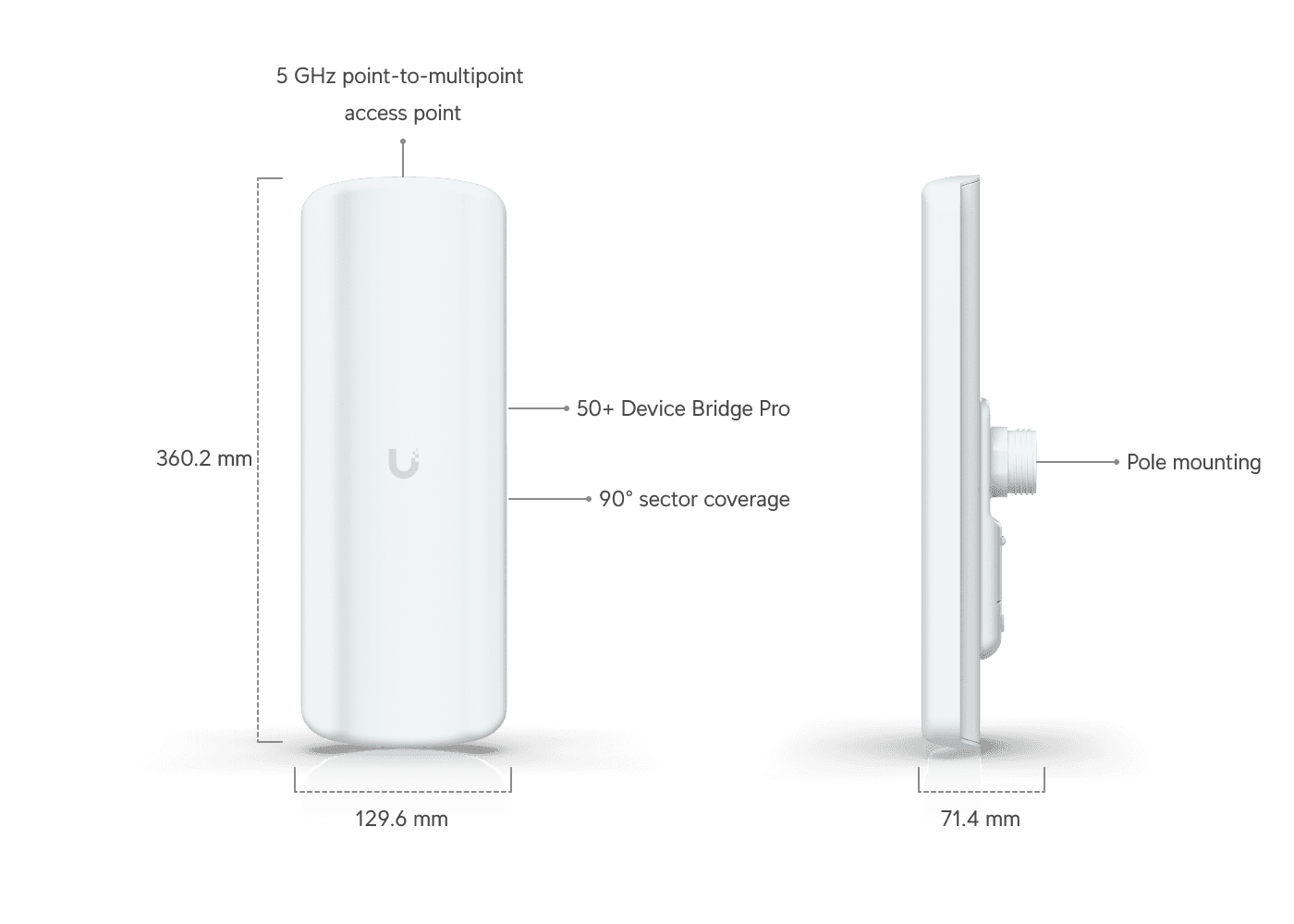 5 GHz point-to-multipoint access point that wirelessly bridges 50+ Device Bridge Pro clients at 5+ km distances.