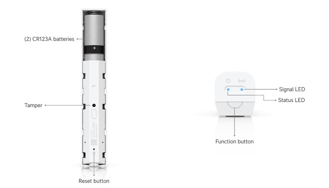 De sensor werkt op twee CR123A batterijen en gaat tot 3 jaar mee. Batterijen zijn eenvoudig te vervangen, waardoor onderhoud minimaal blijft.