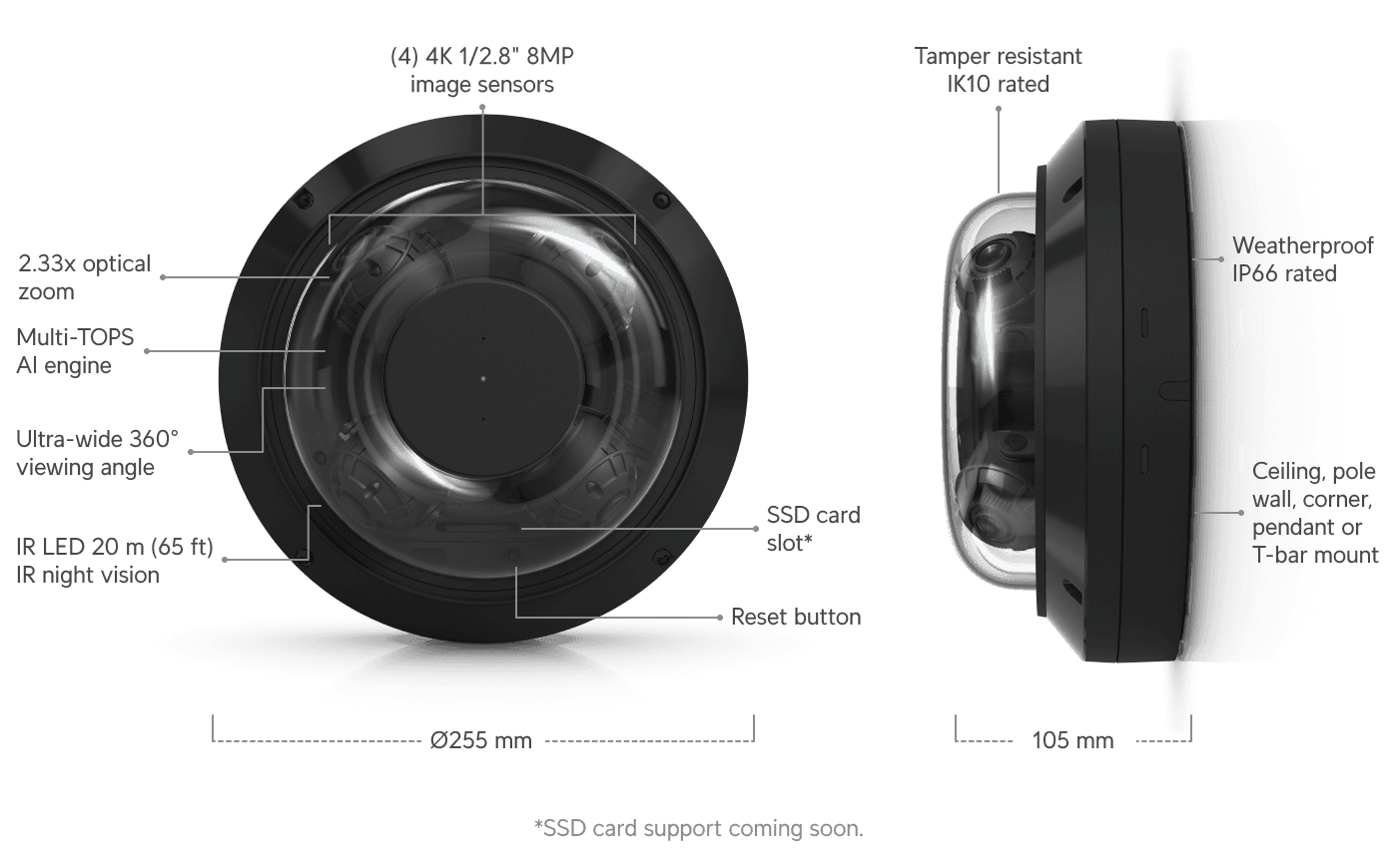 Elke lens is afzonderlijk verstelbaar en kan rondom het chassis worden gepositioneerd. Hierdoor kun je kiezen voor volledige 360° dekking of juist focussen op specifieke zones zoals ingangen, parkeerplaatsen of gangen.